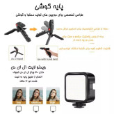 دارای سه پایه، گیره تلفن، نور قابل تنظیم و میکروفون جنس پلاستیک ABS بادوام با یکبار شارژ 1.5 ساعت استفاده مفید میکروفون با ورودی جک 3.5 میلی متری ذارای 49 عدد مهره لامپ 10 درجه تنظیم نور کاربرد گسترده پایه تنظیم شونده و سازگار با اکثر تلفن های همراه و دوربین ها قابل حمل و جمع و جور