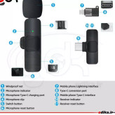 میکروفون وایرلس (صدای مکالمه انتقال نمیدهد و فقط برای ضبط صدا و صدای فیلمبرداری و لایو تصویری مورد استفاده است) مناسب برای تایپ C و آیفون لایتینگ قابلیت اتصال بدون هیچ برنامه ای دارای صدای شفاف و واضح قابلیت پخش زنده در شبکه های اجتماعی سایز کوچک و قابل حمل