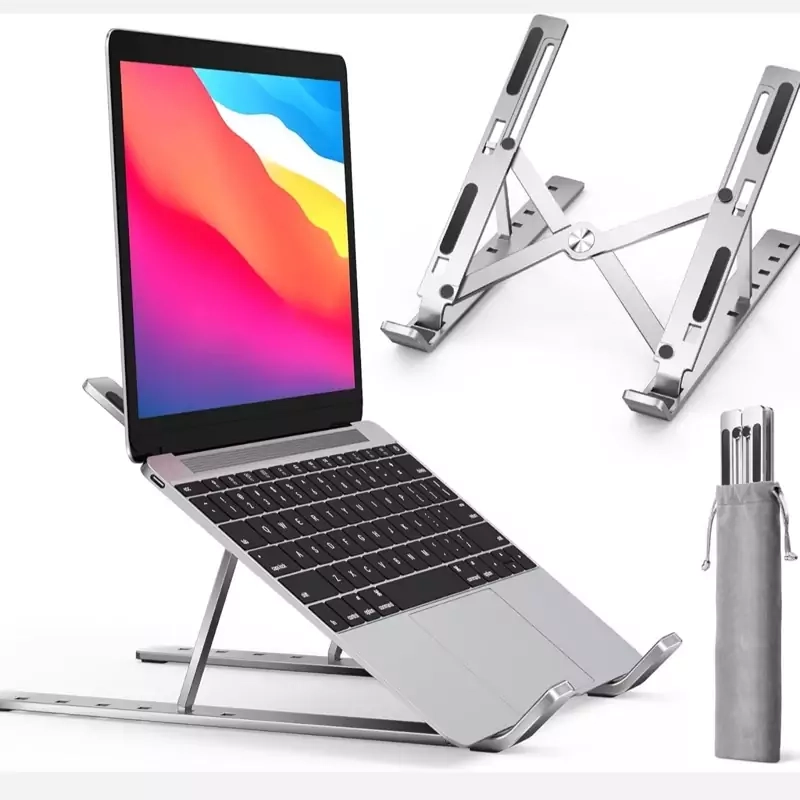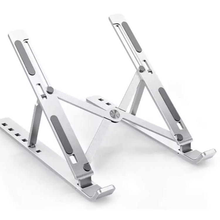 استند لپ تاپ فلزی با قابلیت تا شدن | ساخته شده از جنس آلومینیوم | حجم و وزن بسیار کم | امکان تنظیم زاویه لپ تاپ یا تبلت |کمک به تهویه و خنک شدن سریعتر لپ تاپ یا تبلت | جلوگیری از ورود ذرات روی سطح به داخل فن لپ تاپ |