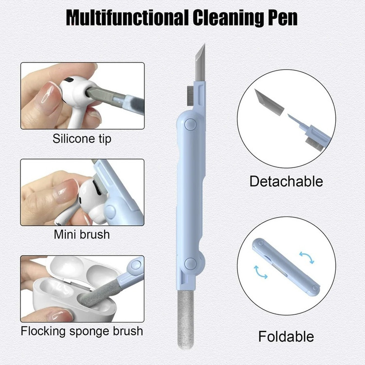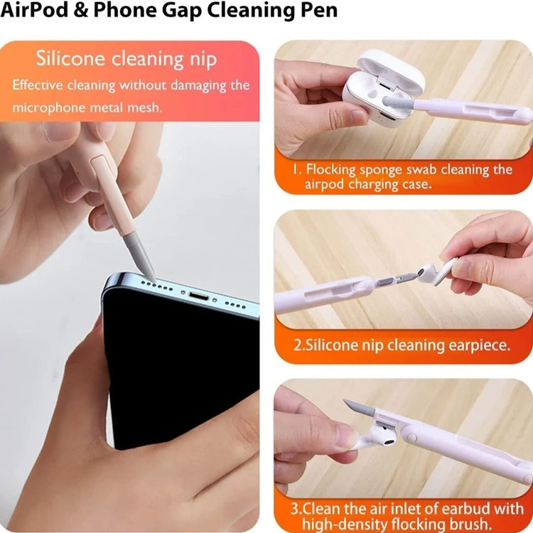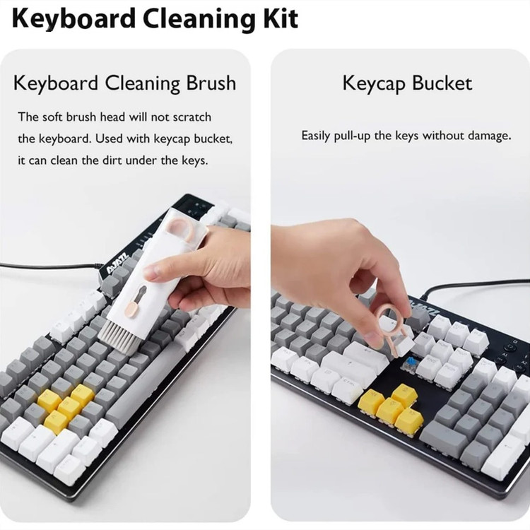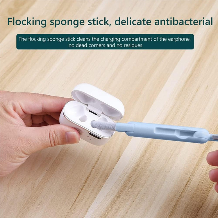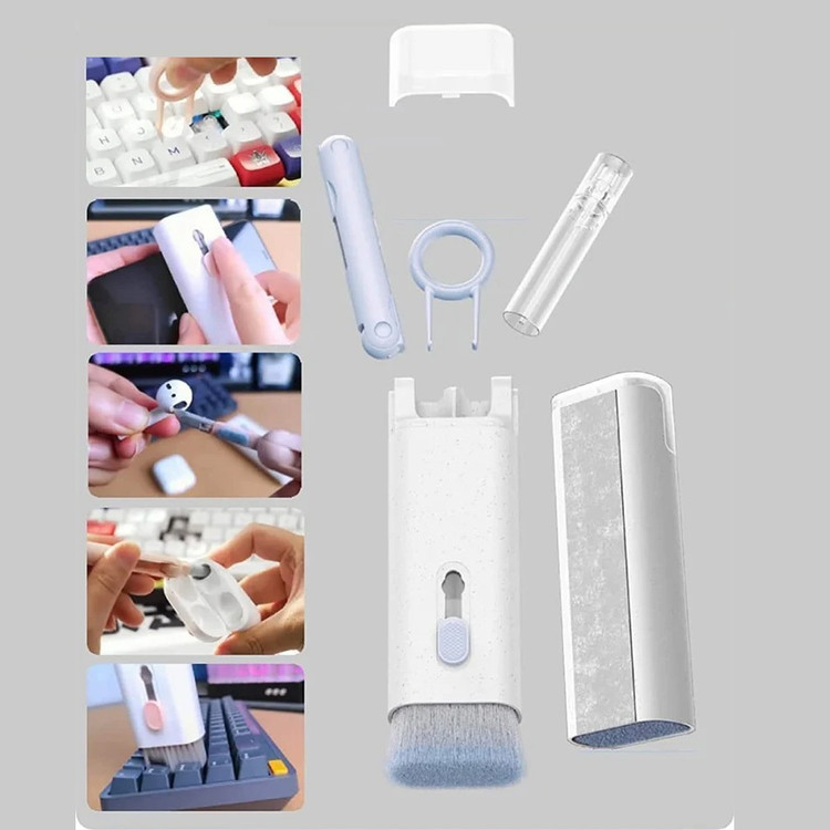 این کیت تمیزکننده 7 کاره شامل 1 برس بزرگ با تراکم بالا، 1 عدد پد تمیز کننده فیبری (مخصوص سطوح مانند مانیتور) ، 1 قلم تمیز کننده گوشی (شامل نوک فلزی، اسفنج و مینی برس با چگالی بالا)، 1 عدد کلیدکش کیبورد و 1 بطری اسپری می باشد. این سرویس پاک کننده چند منظوره می تواند هر خواسته شما را برای تمیز کردن وسایل الکترونیکی برآورده کند. اولین ابزار یک خودکار تمیزکننده تاشو با نوک سیلیکونی، برس کوچک سخت و اسفنج جمعکننده کثیفی ها ، مناسب برای تمیز کردن ایرپاد و سایر هدفونها یا هندزفری ها. نوک سیلیکونی برای تمیز کردن لکه های شکاف است. دومین ابزار برس کوچک برای تمیز کردن گرد و غبار سطوح عمیق و اسفنج دسته دار برای تمیز کردن حفره های کیس شارژ ایرپاد ها میباشد. ابزار سوم تمیز کننده لپ تاپ، رایانه، تبلت و صفحه کلید می باشد کافیست برس نرم بزرگ را بکشید تا گرد و غبار روی رایانه، لپ تاپ، تبلت و صفحه کلید پاک شود. و همچنین می توانید از کلیدکش کیبورد جدا کردن کلیدهای صفحه کلید مکانیکی برای انجام این کار استفاده کنید. ابزار بعدی تمیز کننده مانیتور، صفحه نمایش، دوربین، ساعت و تلویزیون میباشد: در کنار یک بطری خالی اسپری 5 میلیلیتری، مایع تمیزکننده یا آب را درون بطری قرار میدهید و از صفحه فیبری برای تمیز کردن صفحههای مختلف استفاده میکنید. به عنوان مثال صفحات نمایش ، تلویزیون، ساعت، دوربین و غیره.اندازه جمع و جور و سبک وزن: 7 ابزار تمیز کردن کامپیوتر به طور مرتب در یک جعبه مستطیلی قرار گرفته اند. اندازه کیت پاک کننده فقط 4.88 * 1.73 * 1.18 اینچ و وزن آن تقریبا 80 گرم است. برای سفر به اندازه کافی کوچک است و می توانید آن را حمل کنید. در همین حال، شما همچنین می توانید هر ابزار تمیز کننده ای را به طور جداگانه بیرون بیاورید.